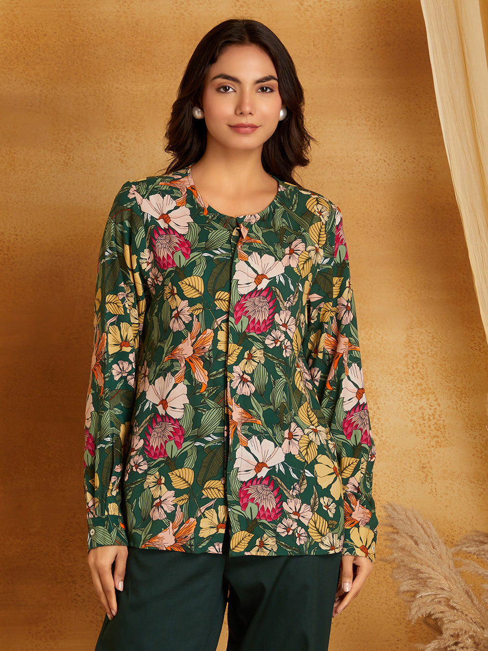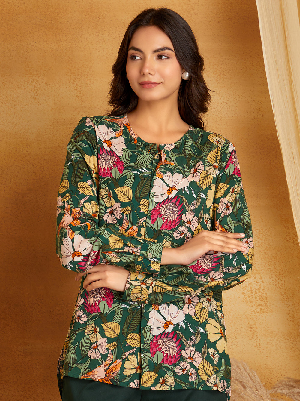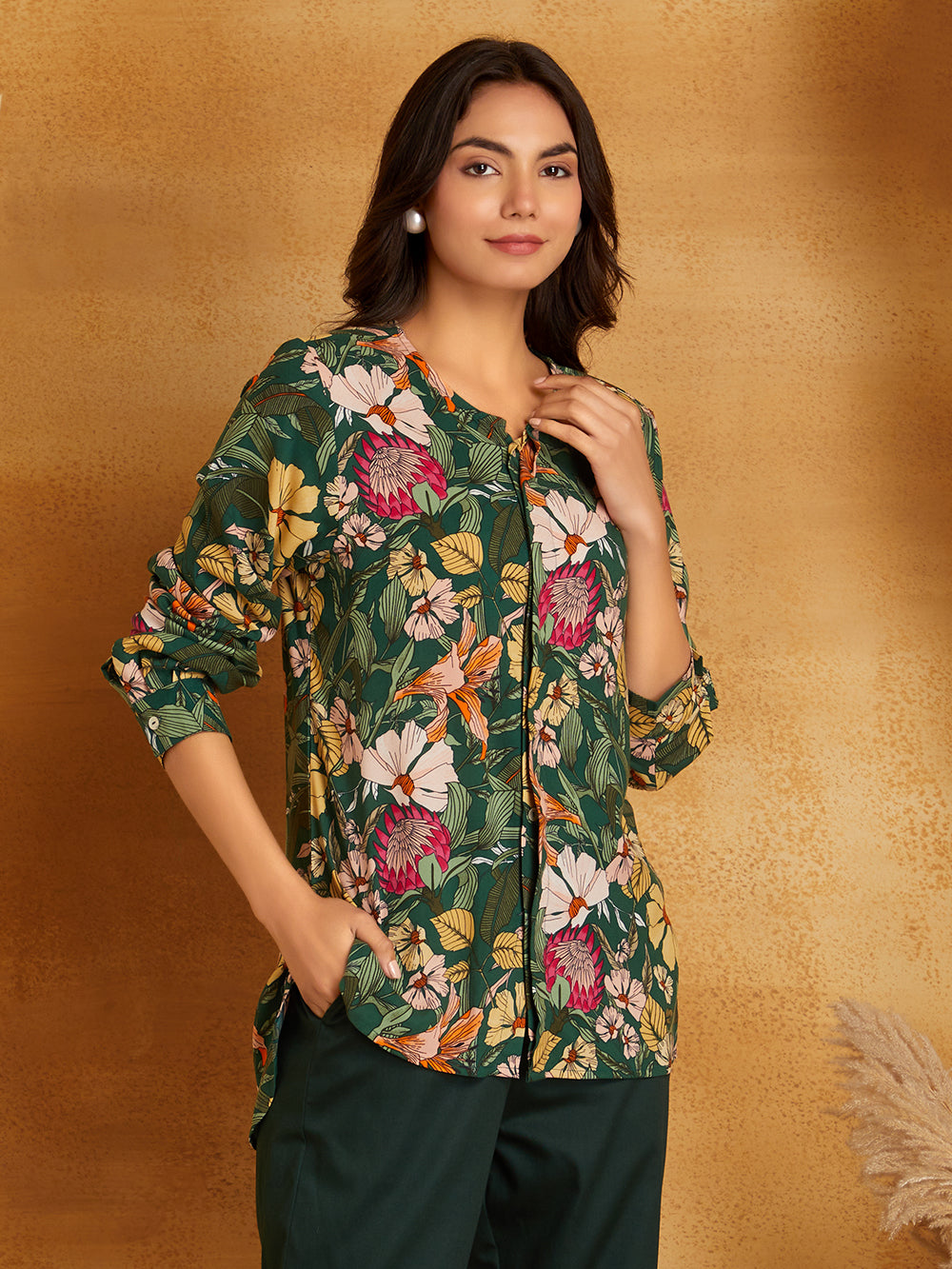 Brighten up your wardrobe with this bold floral coord set, featuring a soft, breathable shirt that ensures all-day comfort. Paired with dark green twill pants designed for a polished, formal look, the trousers can easily be styled with a variety of tops—making this set a versatile must-have for any occasion.