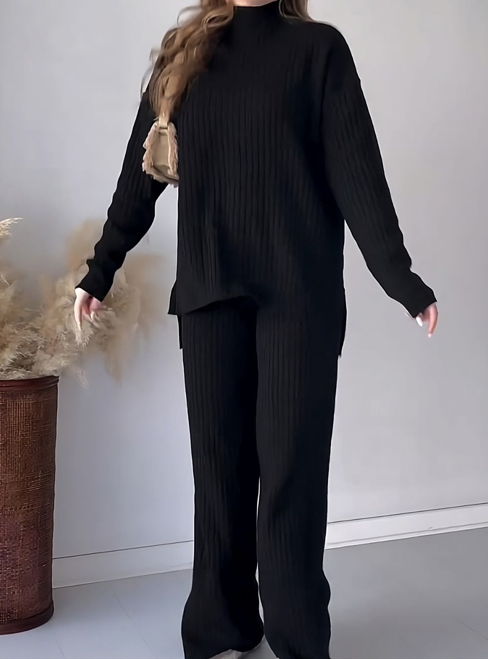 This cozy knit co-ord set, features long-leg pants and a chic turtleneck sweater, perfect for effortless elegance and modern minimalism.
