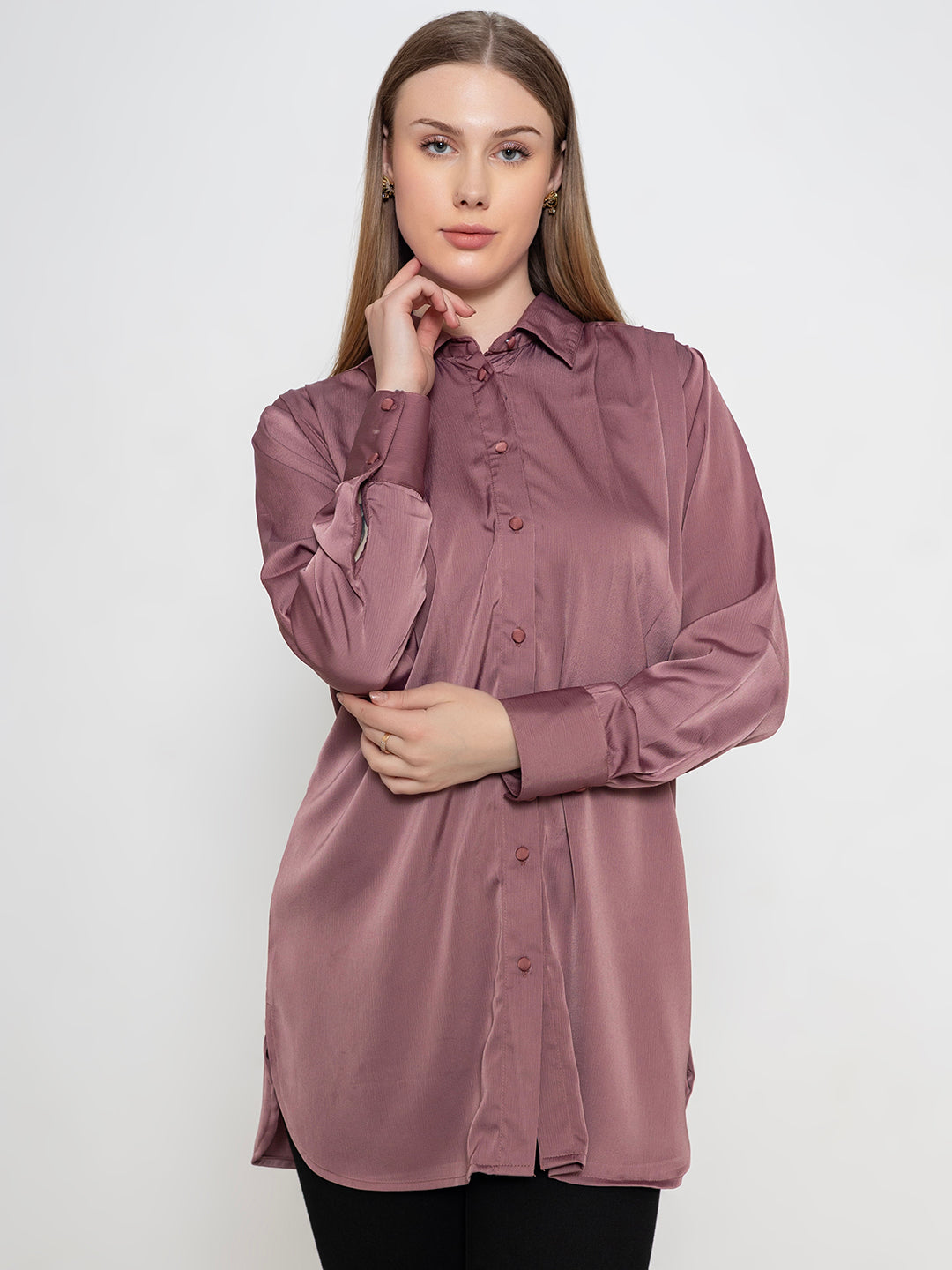 Elevate your everyday style with this dusty mauve shirt, designed for the modern woman who values both elegance and ease. Crafted from a luxe, lightweight fabric, it features a soft sheen that adds a touch of sophistication. The shirt boasts a classic collar, full front button closure, and long sleeves with buttoned cuffs. Subtle gathers near the shoulders and a relaxed silhouette ensure a flattering, flowy fit — perfect for both casual brunches and smart evenings out. Style it with skinny jeans or tailored trousers for an effortlessly chic look.