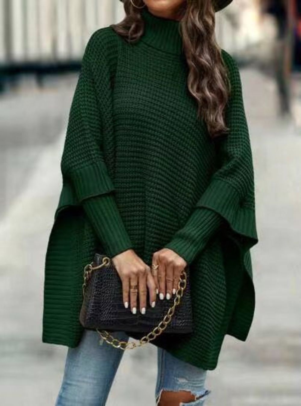 Cozy turtleneck batwing poncho sweater featuring a loose fit, elegant drape, soft knit fabric, and timeless style for versatile wear.